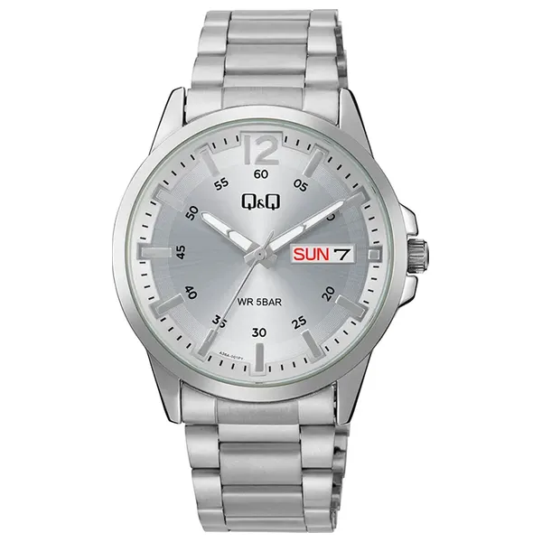 Men's watch with a round metal case measuring 42mm in diameter and 11.5mm in thickness, and a silver dial. The metal bracelet is 22.1mm wide and 205mm long with a folding clasp. Water resistant to 5 bar. Weight: 101g
