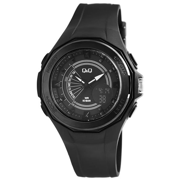 Women's analog watch in black with a stainless steel case and rubber strap, 42mm diameter and 11mm thickness, water resistant up to 100 meters, date display at 3 o'clock, pin clasp, quartz movement