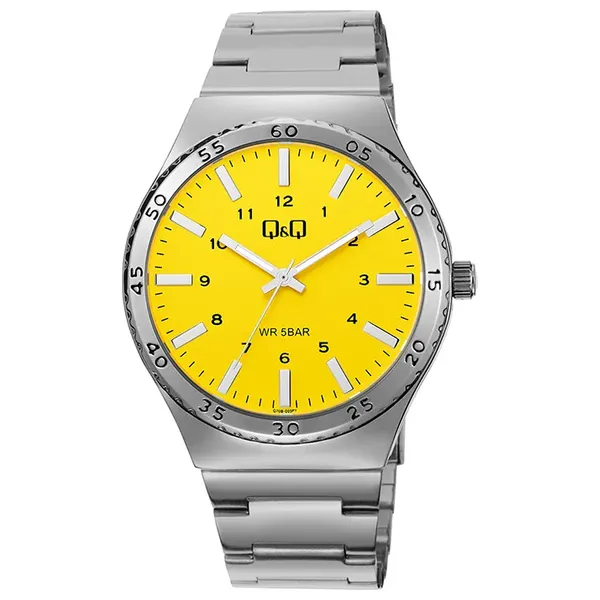 Men's watch, 42mm wide and 11.8mm thick, with a 20mm wide silver metal case and bracelet, mineral glass, 5 bar water resistance, and weighing 99g