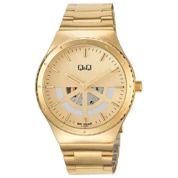 Men's watch with a width of 42mm and a thickness of 9.7mm, with a gold metal case and bracelet with a width of 20mm, gold dial, mineral glass, water resistance of 5 bar and a weight of 96g.