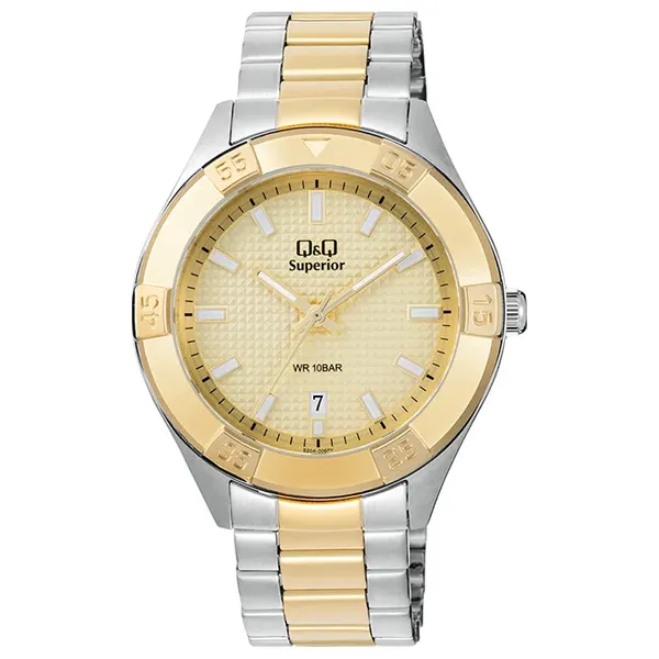 A stylish and practical men's watch with a round gold dial, a two-tone metal bracelet, an analog display, and scratch-resistant mineral glass. It features a 42.5mm case diameter, 10mm thickness, a 210mm band length and 20.03mm band width, a silver case, weighs 122 grams, and is water-resistant up to 10 bar.