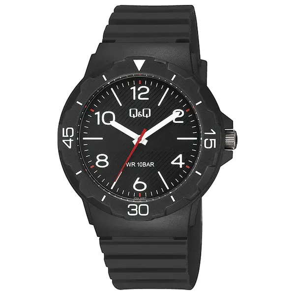Men's watch with a diameter of 43mm and a thickness of 10.5mm, black resin case, dial, and bracelet, Cal.2035 minute quartz movement, water resistance up to 10 bar, round design, and lightweight at 38g.