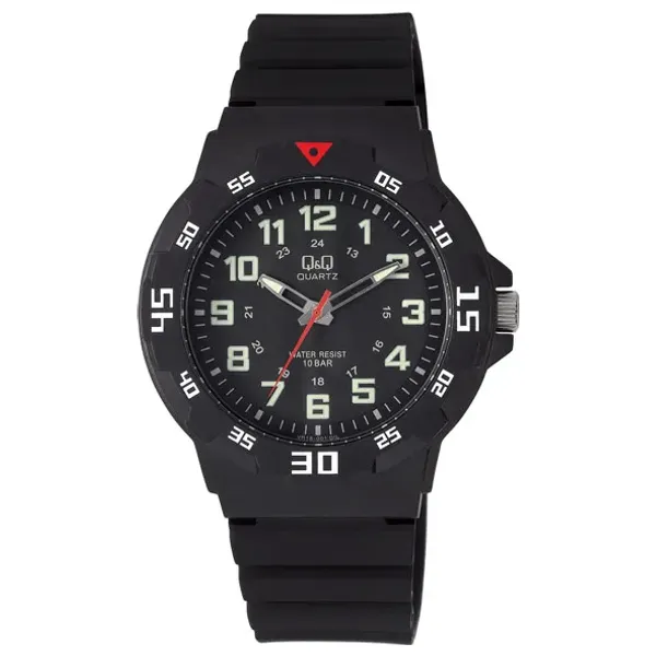 A men's sports watch with a 43mm diameter and 10.5mm thickness, crafted from resin with shock-resistant acrylic glass. The dial is black, and the 20mm wide, 215mm long resin strap features a classic buckle. It is powered by a Cal.2035 quartz movement, water-resistant up to 10 bar, and weighs a lightweight 38g.