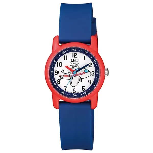 Children's watch with a round resin case and dial, 39 mm in diameter and 9.4 mm thick, acrylic glass, blue resin strap 185 mm long and 16 mm wide with a traditional buckle, weighing 19 grams, water resistant up to 10 bar, powered by a Cal.2035 quartz movement.