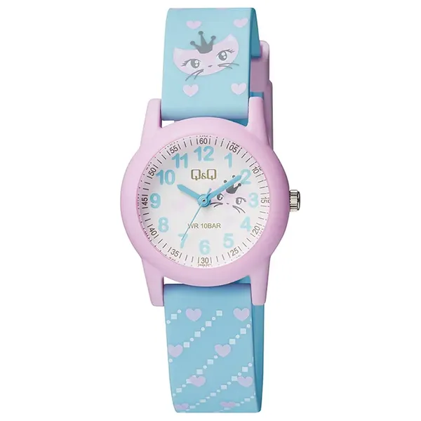 A stylish and practical children's watch with a round white dial and a durable blue resin strap, featuring an analog display and scratch-resistant acrylic glass. It has a 30mm case size, is 10mm thick, weighs only 20 grams, and has a secure buckle clasp. Water resistant up to 10 bar.