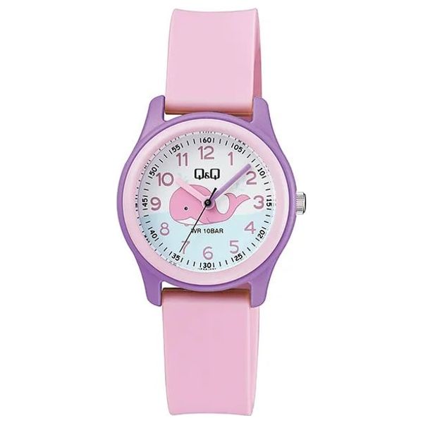 A stylish and practical children's watch with a round white dial, a durable resin strap, an analog display, and scratch-resistant acrylic glass. It features a 32mm case size, 10mm thickness, and a lightweight design weighing only 21 grams, along with a secure buckle clasp. Water resistant up to 10 bar.
