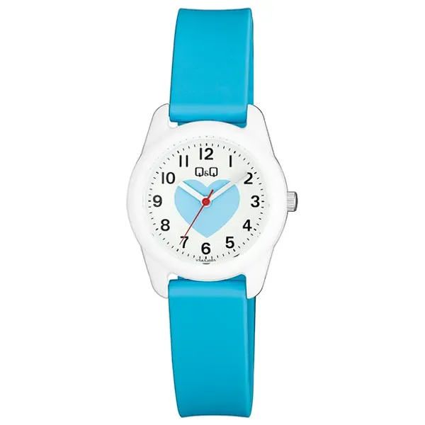 Women's watch with a white round dial and blue round resin case, 28 mm diameter and 8.2 mm thickness, acrylic glass, resin strap with buckle, water resistant up to 10 bar, and Cal.2035 quartz movement.