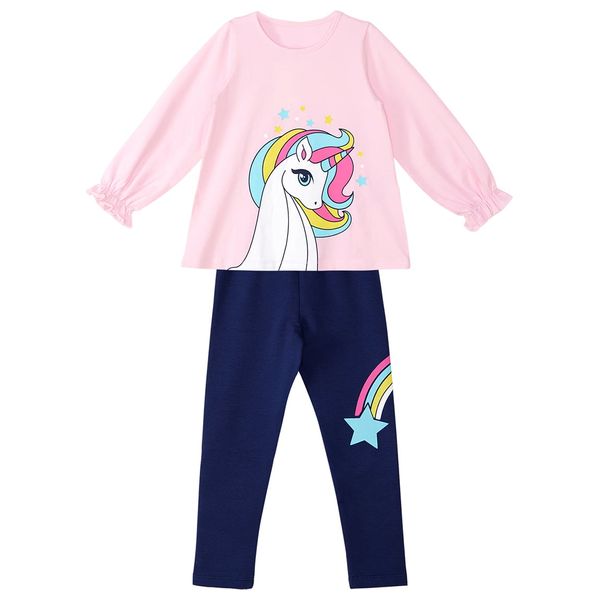 2 piece girl set. Cotton jersey, tunic size t-shirt with a unicorn print on. And mid-thick cotton leggings with a rainbow print on single leg., Material Top,Bottom: 95% Cotton 5% Elastane , Washing ins. Wash seperately according to colors. Wash at 30C. Do not bleach and tumble dry.