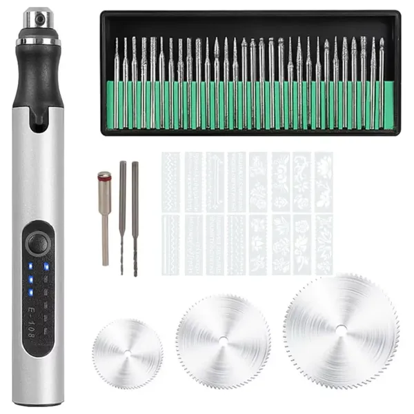 Lightweight electric engraving pen for carving, grinding, and polishing wood, glass, metals, and jewelry.