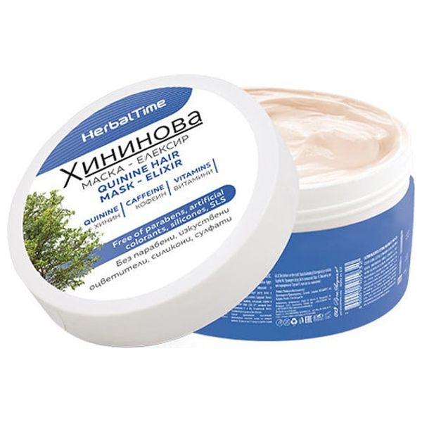 Rosa Impex Herbal Time Quinine Hair Mask Elixir nourishes and strengthens hair and scalp while supporting healthy growth. Formulated with quinine, caffeine, nettle extract, capsaicin, and PHYTOCHEM HAIR LOSS SP with vitamins E and B6, D-Panthenol, Biotin, and zinc chloride. It nourishes the scalp, improves hair texture, and helps achieve thicker, healthier hair. To use: apply to damp hair, leave for 3-5 minutes, then rinse. Size: 200 ml.
