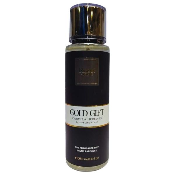 Gold Gift Fine Fragrance Mist by Rosel Fragnance blends warm amber with spicy and woody undertones, enriched by fruity hints of berry and orange, and complemented by jasmine and orange blossom. This women’s body mist delivers a luxurious aroma with moderate lasting power, ideal for everyday wear and special occasions.