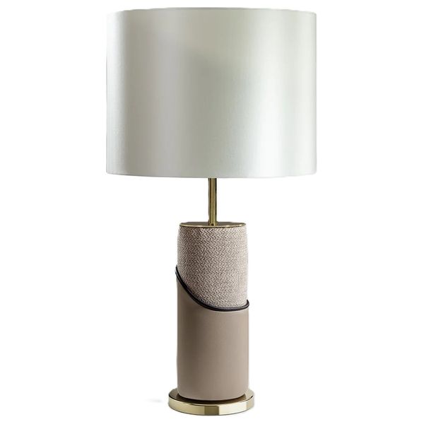 A table lamp with a beige leather-covered metal base and a gold-finished pole with a fabric shade, providing warm, diffused light. Measuring 360 x 720 mm, it's suitable for living rooms, bedrooms, and offices.