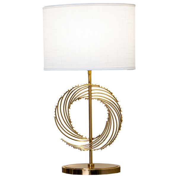 A table lamp with a circular bronze metal base and a white fabric shade. The modern spiral design provides warm, balanced illumination. Made of durable, high-quality materials, it's suitable for living rooms, bedrooms, study rooms, offices, restaurants, and hotels.