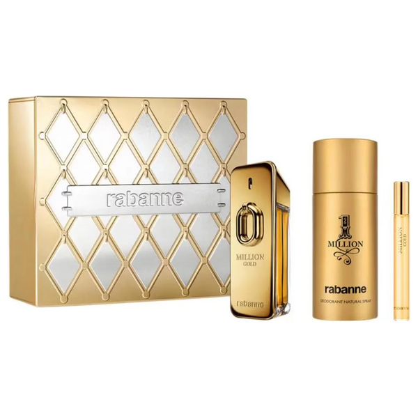 A luxurious gift set with a top note of mandarin, a middle of cedarwood, and a base of sandalwood, the set includes: - Million gold perfume 100 ml. - Deodorant spray 150 ml. - Travel spray 10 ml.