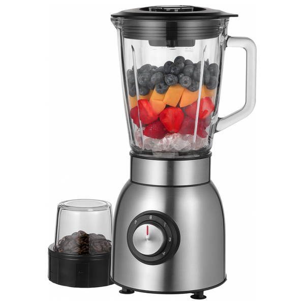 Powerful 1500W blender with an extra grinder, ideal for smoothies and grinding, features strong steel blades, a heat-resistant glass jug, and a coffee and nut grinder.