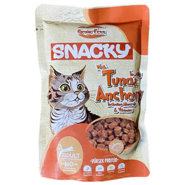 Food specifically formulated for adult cats; contains tuna and anchovy chunks in a delicious jelly. Designed to provide complete nutrition with minerals and vitamins, and free from grains, artificial colors, and preservatives.