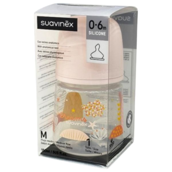 The Suavinex S Feed Bot 150 ANA S S1M Dreams Pink baby bottle features a wide neck and a silicone anatomical nipple, ideal for infants aged 0-6 months. Its medium flow valve ensures a comfortable feeding experience, making it a trusted choice for parents seeking quality and safety in baby feeding bottles.