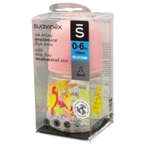 This pink baby feeding bottle by Suavinex features a wide anatomical silicone nipple designed for slow flow feeding, making it ideal for infants. and soft silicone material ensure comfortable and safe feeding for your little one, whether at home or on the go.