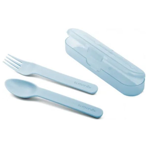 Suavinex S Cutlery Set with Case is a two-piece baby feeding utensil in a vibrant blue. The spoon and fork are designed for small hands, packaged in a sturdy carrying case for easy transport and storage. Made in Spain, this cutlery emphasizes safety and quality to support comfortable mealtimes for your baby.