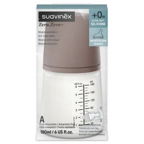 Suavinex Zero.Zero Bottle is a 180 ml baby bottle with an ultra-soft silicone nipple and adaptable flow. Its anti-colic design supports comfortable feeding and breastfeeding-friendly use, with measurement marks up to 180 ml (6 US fl oz) for easy feeding planning.