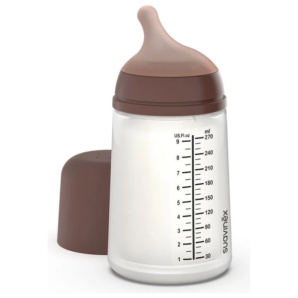 The Suavinex Zero Zero Anti Colic bottle is designed to limit air intake with an anti-colic silicone bag that contracts as the baby sucks, helping to reduce gas and protect milk nutrients from oxidation. It uses a BPA-free silicone nipple and is available in brown 270ml Nipple options include Adaptable (A), Slow flow (S), and Medium flow (M), supporting both breastfeeding and bottle feeding.
