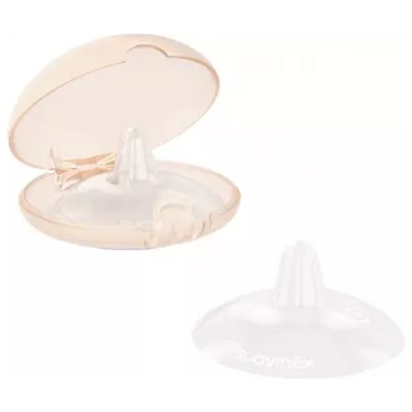 Suavinex Silicone Nipple Shields (2 pieces) are soft, thin shields designed to facilitate breastfeeding and protect sensitive nipples. The redesigned shape minimizes the newborn’s nose contact with the nipple during feeding, making latching easier. They adapt to the breast even with flat, retracting, or inverted nipples, and are practically imperceptible to the baby. Sizes: S 21 mm and M 24 mm.