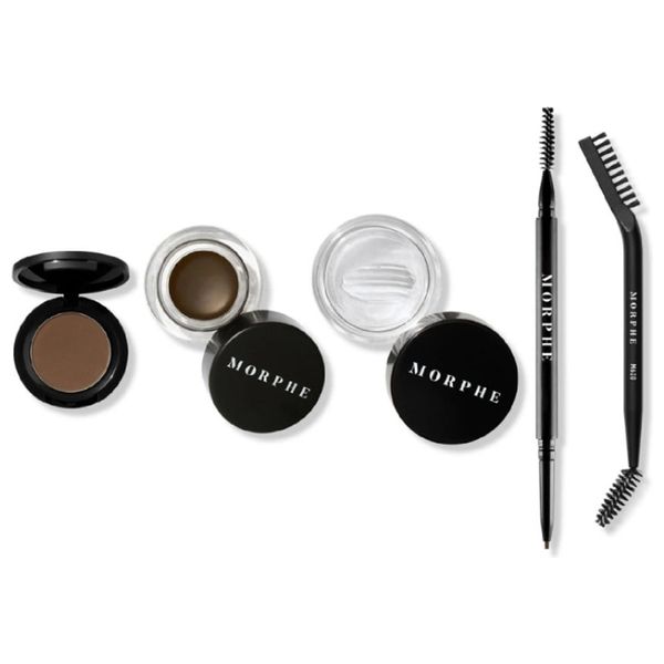 An amazing set for filling and defining brows, including setting wax, double ended brow brush, brow pencil, brow powder and brow gel cream.