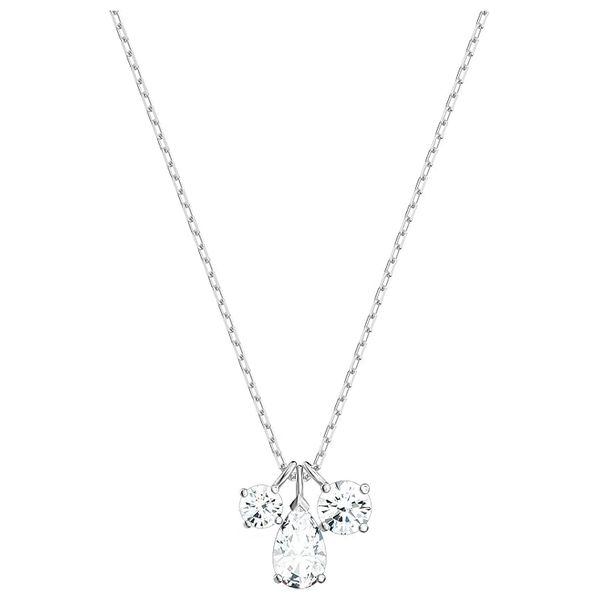 Swarovski Ladies Necklaces. SKU: 5571077. Swarovski Attract Crystal Ketting Cluster Pendant Necklace. This pendant by Swarovski is adorned with three shimmering crystals; the central drop-shaped stone is complemented beautifully by two smaller, round stones. A refined yet simple design. Material: Rhodium plated, Dimensions: Pendant size: 1/2x1/2 inches, Length: 15 3/4 inch