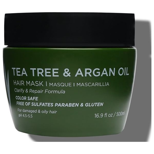 Argan oil and tea tree hair mask, soothes irritated scalp, reduces itching and dryness, and gives a feeling of comfort and freshness, and repairs damaged ends for super soft and shiny hair, suitable for oily and damaged hair.