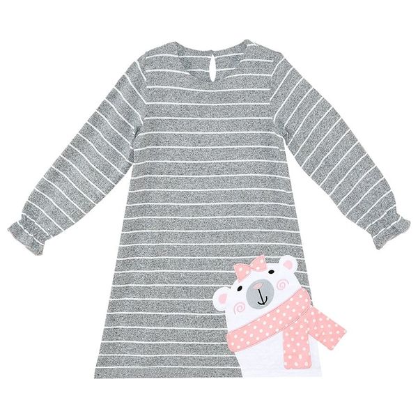 Grey, striped, roun neck girl dress. Feature a cute polar bear applique. Has frills on wrists. All Denokids products are produced within kids safety guidelines and dedected by needle dedectors., Material 97% Polyester 3% Elastane, Washing ins. Machine wash at 30°C. Wash inside out. Do not bleach. Do not tumble dry. Iron backside on low heat.