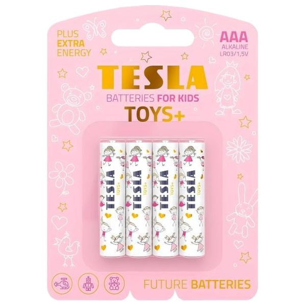 Tesla alkaline AAA LR03 batteries (4-pack) delivering 1.5V power for toys and small electronics. Part of the TESLA TOYS+ range, these reliable alkaline cells provide stable energy for playtime and everyday use.