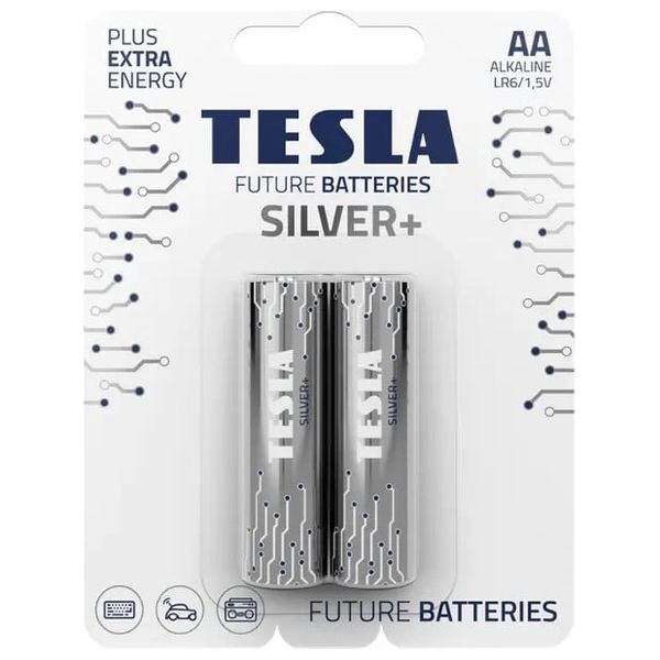 Tesla Silver+ AA alkaline batteries (LR6) deliver reliable 1.5V power for everyday devices. This 2-pack provides ready power for remotes, toys, flashlights, and other gadgets, offering stable performance and long shelf life for daily use at home or on the go.