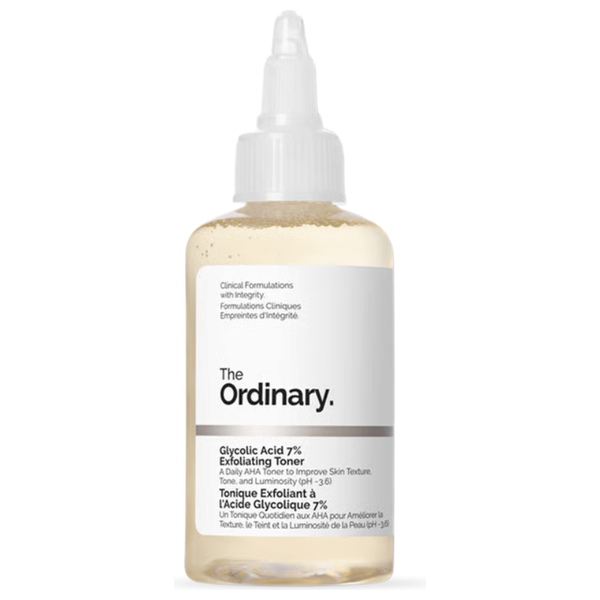 The Ordinary Glycolic Acid 7% Exfoliating Toner is a daily AHA toner designed to improve skin texture and radiance by gently exfoliating the surface. Formulated with glycolic acid at 7%, it helps refine pores and reveal smoother skin when used consistently. Patch test before first use, avoid mixing with retinoids on the same night, and start with gradual frequency to minimize irritation. Suitable for most skin types when used as directed.