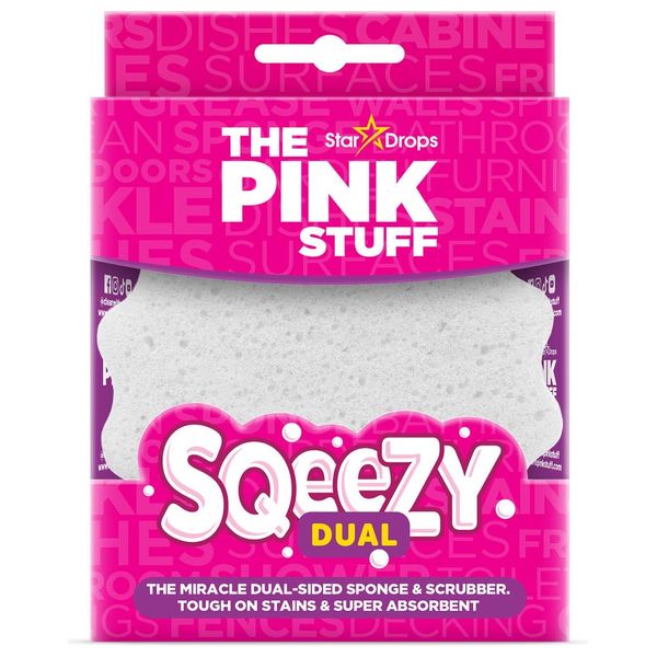 The Pink Stuff Duo Sponge and Scrubber, has two sides for all-in-one cleaning: a powerful scrubber for tough stains and a super-absorbent sponge for liquids.