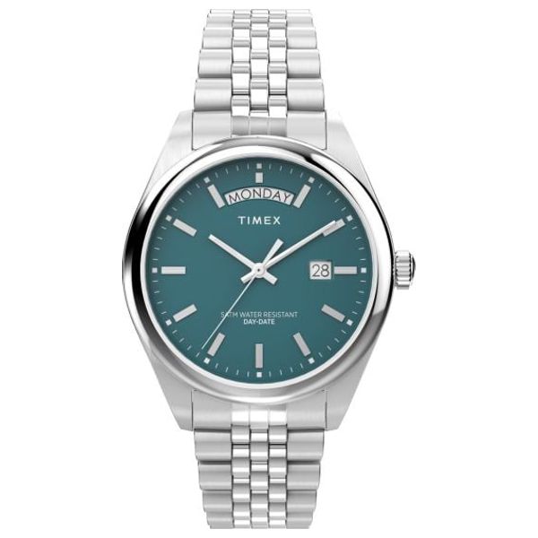 A men's watch with a precise quartz movement, splash and rain resistant up to 5 bar, featuring a 41mm diameter and 10mm thickness round stainless steel case, a green dial, and mineral crystal. The silver-tone stainless steel bracelet is adjustable from 14-22cm and has a folding clasp.