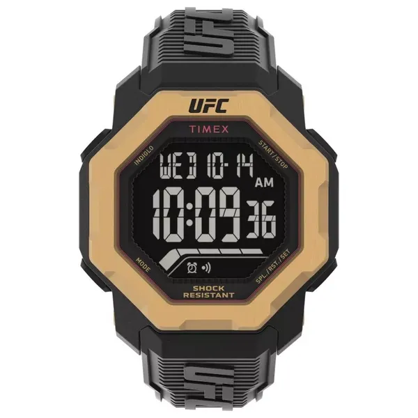 A men's watch with a digital dial and quartz movement, water-resistant up to 100 meters. It features a 48mm diameter, 16mm thickness, square industrial case with acrylic glass. The strap is 26mm wide and black rubber.