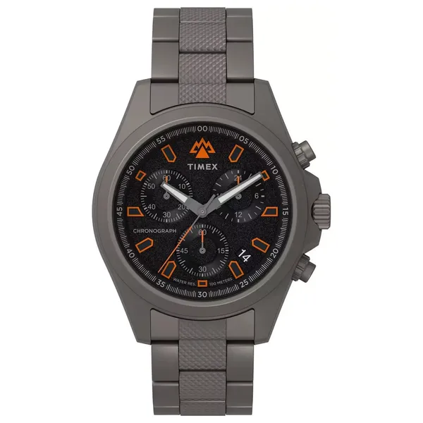 Timex men's watch with a 43mm gray stainless steel case, black dial, and sapphire crystal. It comes with a 20mm wide gray stainless steel bracelet. The watch features a quartz movement and is water resistant up to 100 meters.