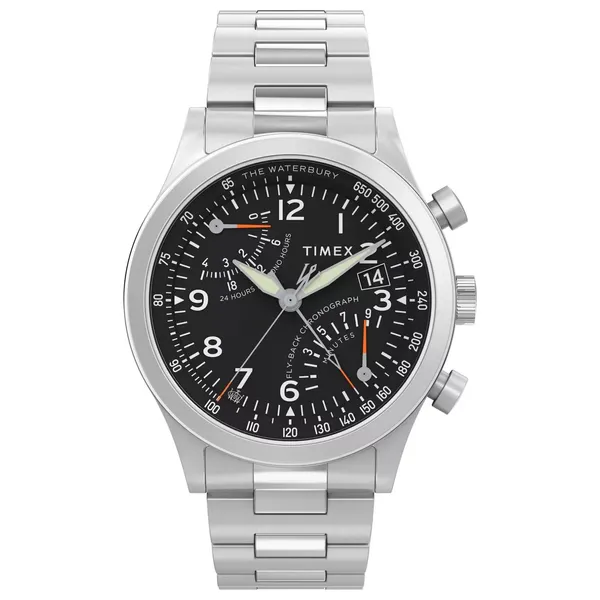 Timex men's watch with a 42mm diameter and 12mm thickness stainless steel case, black dial with mineral glass. 22mm wide stainless steel bracelet in silver. Water resistant up to 100 meters. Precise quartz movement.