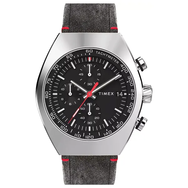 Men's watch with quartz movement and water resistance up to 50 meters. The round brass case is 42mm in diameter and 11mm thick, with a black dial and mineral glass. The strap is 22mm wide and black leather.