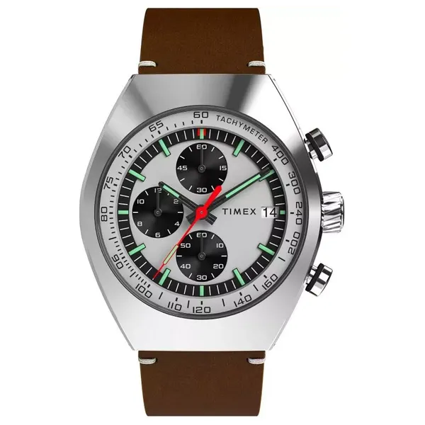 Men's watch with quartz movement and water resistance up to 50 meters. The round brass case is 42mm in diameter and 11mm thick, with a multi-colored dial and mineral crystal. The strap is 22mm wide brown leather.