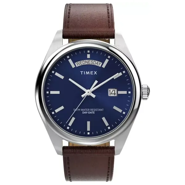 Men's watch with quartz movement and water resistance up to 50 meters. The round stainless steel case is 41mm in diameter and 10mm thick, with a blue dial and mineral glass. The strap is 20mm wide brown leather.