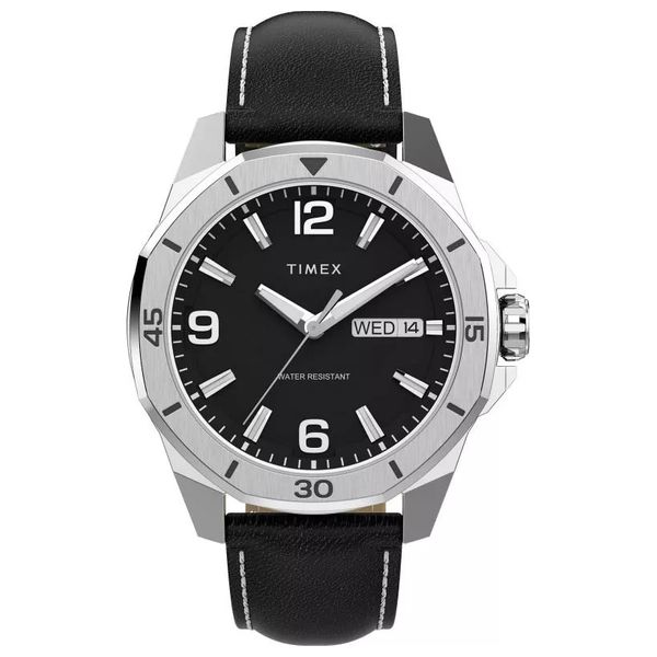 A men's quartz watch with a 46mm diameter, 5mm thick round brass case and a black dial protected by mineral glass. The 10mm wide black steel bracelet is water-resistant up to 50 meters.