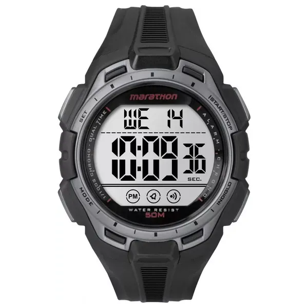 A men's watch with a precise digital quartz movement, water-resistant up to 50 meters. It features a round synthetic case measuring 43mm in diameter and 14mm in thickness, with a gray dial protected by mineral glass.