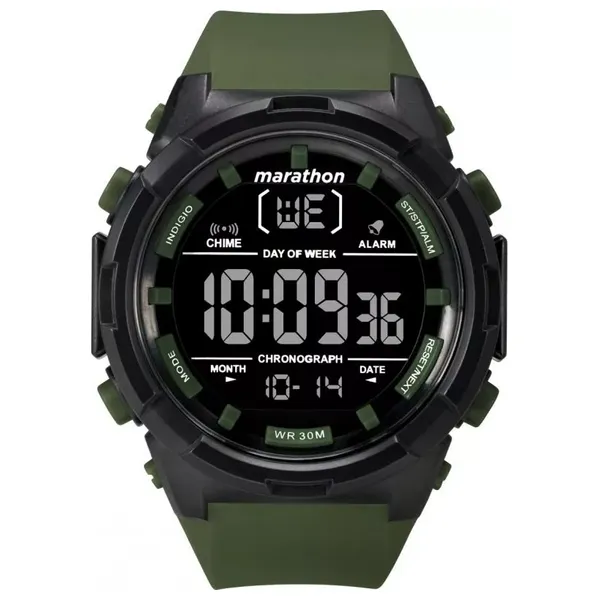 A men's watch with a precise digital quartz movement, featuring a luminous display for easy reading in the dark. It comes in a round, 50mm diameter, 16mm thick synthetic case with scratch-resistant Hisalite glass. The durable, 28mm wide green plastic strap fits a maximum wrist circumference of 21cm. The watch is water-resistant up to 30 meters.