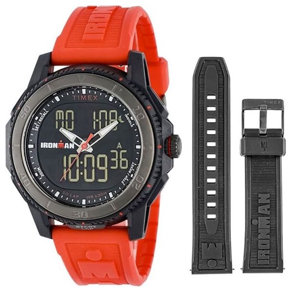 A men's sports watch with a quartz movement, water-resistant up to 100 meters, featuring a 45mm diameter and 14mm thickness resin case with mineral glass. It has an analog and digital display, a stopwatch, an alarm, and a backlight with luminous hands. The silicone strap is adjustable from 160 to 210mm.