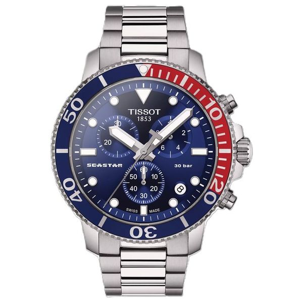 The Tissot Chronograph watch features a 45.5mm steel case and a blue dial with scratch-resistant sapphire crystal. It is powered by a Swiss quartz movement and is water-resistant up to 300 meters. The quick-release bracelet allows for easy style changes. Functions include a chronograph with a 30-minute and 1/10-second counter, and luminous hands for clear reading in low light.