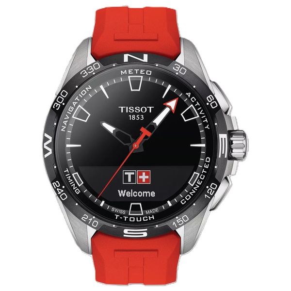 The Tissot watch combines a Swiss quartz movement powered by solar energy and an anti-magnetic titanium case with a ceramic bezel and scratch-resistant sapphire crystal, and multiple functions including time zones, perpetual calendar, alarm, timer, chronograph, altimeter, barometer, thermometer, compass, and notifications.
