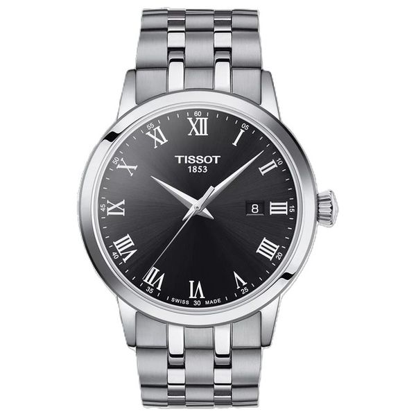 The Tissot Classic watch combines elegance and reliability, with a stainless steel case, black dial with Roman numerals and a date window, hardened sapphire crystal, Swiss quartz movement with a Renata 371 battery and an end-of-life indicator.