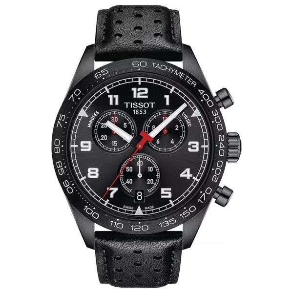 Tissot men's Swiss quartz watch with a round steel case and black leather strap, black dial, scratch-resistant sapphire crystal, tachymeter scale and auxiliary functions