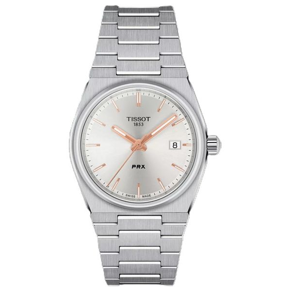 The Tissot PRX watch features a 35mm steel case, Swiss quartz movement, scratch-resistant sapphire crystal, date display at 3 o'clock, and a quick-release bracelet for easy style changes.